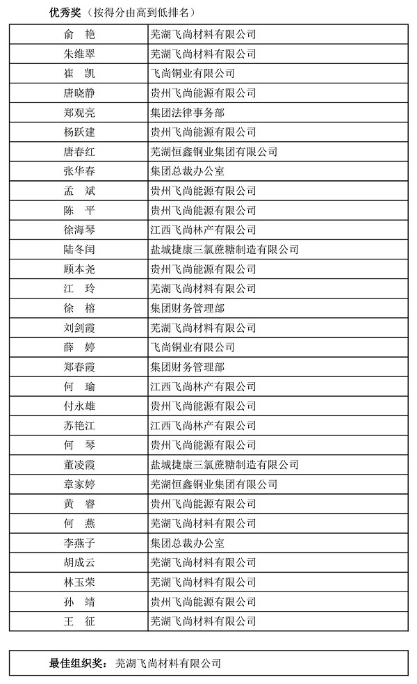 1月13日晚,飞尚集团第四届“飞越杯·山(shān)水文(wén)化”線(xiàn)上直播知识竞赛正式结束。根据竞赛规则,统计所有(yǒu)参赛者的最终得分(fēn),飞尚集团财務(wù)管理(lǐ)部黎浩、江西飞尚林产(chǎn)有(yǒu)限公(gōng)司周金玉分(fēn)别以238分(fēn)、237分(fēn)的成绩获得一等奖,芜湖(hú)飞尚材料有(yǒu)限公(gōng)司获得最佳组织奖。