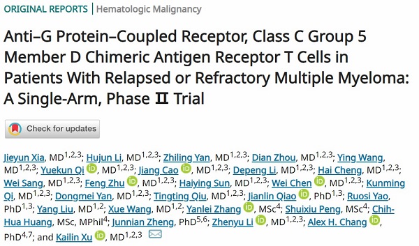 采用(yòng)该项技(jì )术治疗多(duō)发性骨髓瘤的重大医(yī)學(xué)成果已被國(guó)际顶级學(xué)术期刊《Journal of Clinical Oncology》(影响因子50.717)接收发表:Anti–G Protein–Coupled Receptor, Class C Group 5 Member D Chimeric Antigen Receptor T Cells in Patients With Relapsed or Refractory Multiple Myeloma: A Single-Arm, Phase Ⅱ Trial1。该研究采用(yòng)國(guó)际领先的GPRC5D CAR-T细胞治疗技(jì )术,成功治疗了33例复发难治性多(duō)发性骨髓瘤患者,并获得91%的总反应率(ORR)的优异疗效。其中(zhōng),在既往接受过 BCMA CAR-T细胞治疗的9例患者中(zhōng),反应率為(wèi)100%。