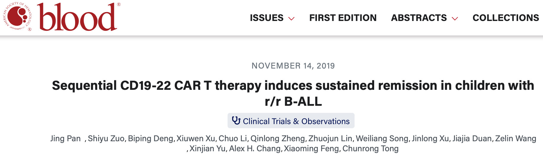 1、Pan J, et al.Sequential CD19-22 CAR T therapy induces sustained remission in children with r/r B-ALL. Blood. 2019 Nov 14. [Epub ahead of print]