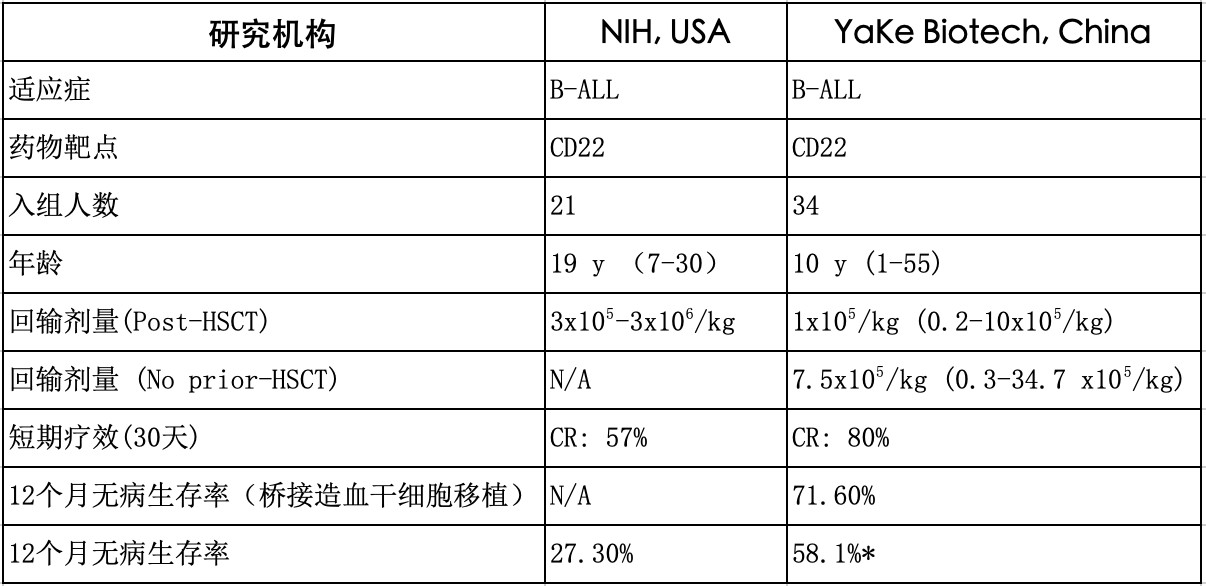 表一、比较针对CD22靶标CAR-T细胞治疗的國(guó)际前沿临床研究结果: